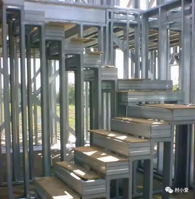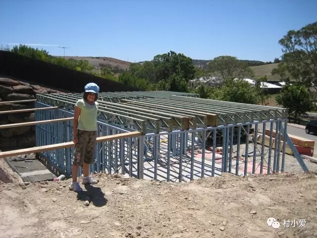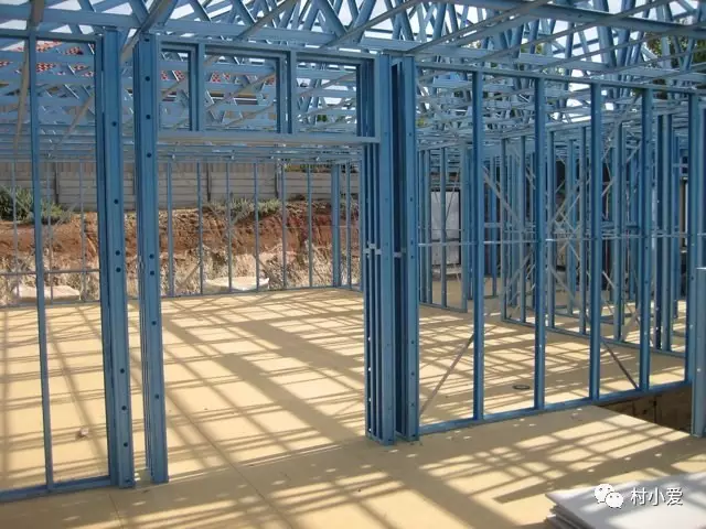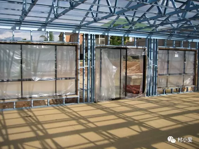 轻钢骨架完成之后,装上保温防潮材料或是采用国内的砂浆喷筑板体技术完成墙体、楼板施工。